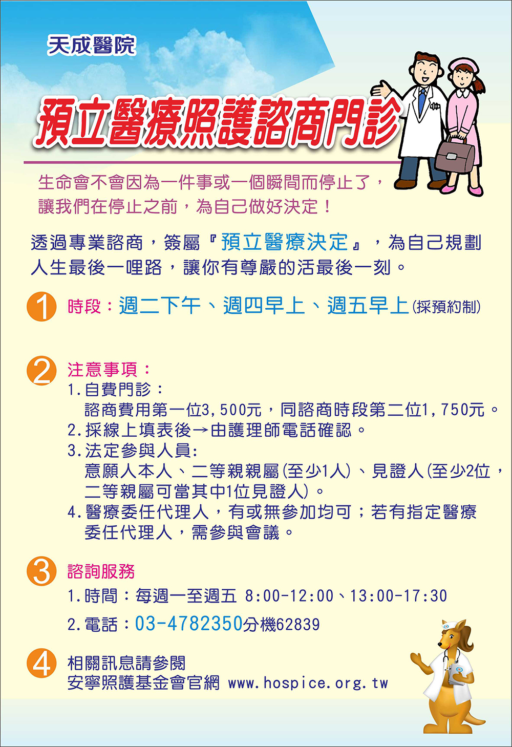 「預立醫療照護諮商」是在自己意識清楚,可以表達的狀態下,至預立醫療照護諮商機構透過諮商過程進行討論。依據自己對生命的想法,當您遇到末期病人、處於不可逆轉之昏迷狀況、永久植物人狀態、極重度失智、或主管機關公告之難以忍受之疾病的五種臨床狀況時,選擇自己期待的醫療照護方式。