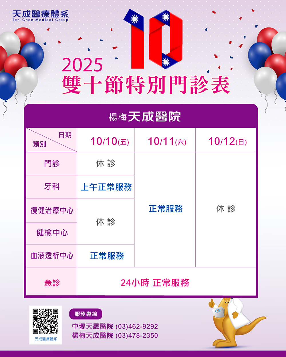 114年雙十節連續假期門診公告